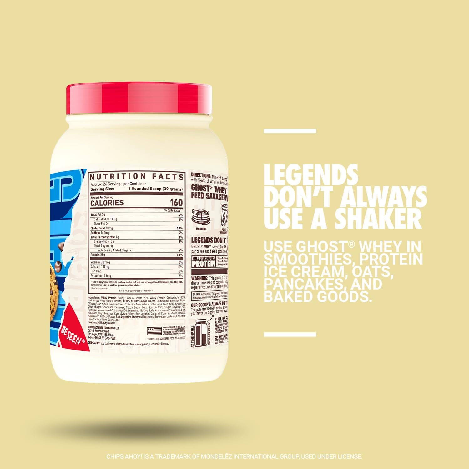 - Versatile and Delicious: GHOST Whey x Chips Ahoy! combines a premium, fully disclosed whey protein blend, a few digestive enzymes, and real Chips Ahoy! cookie pieces in every scoop for a flavor that is second to none. 26 servings.